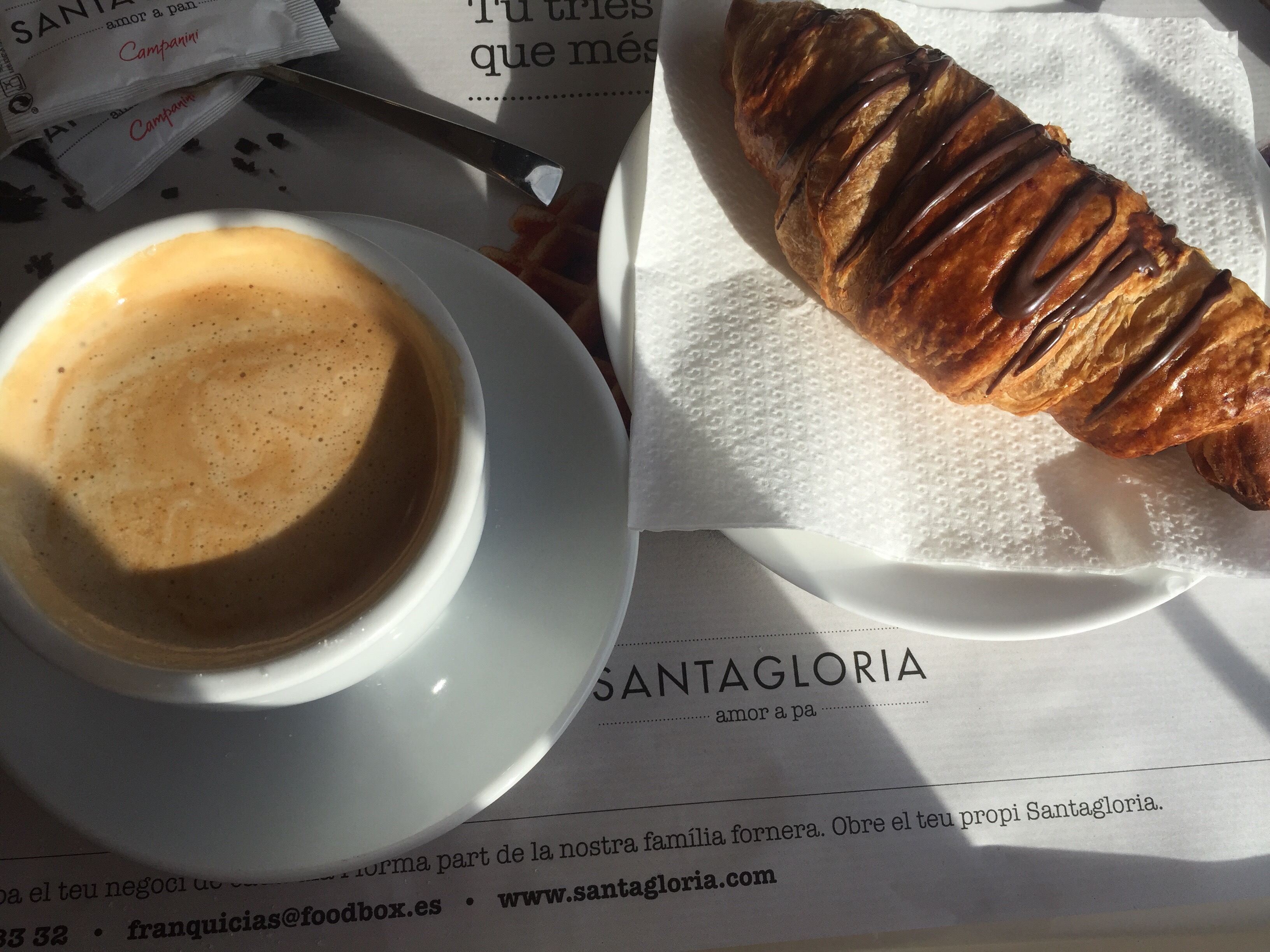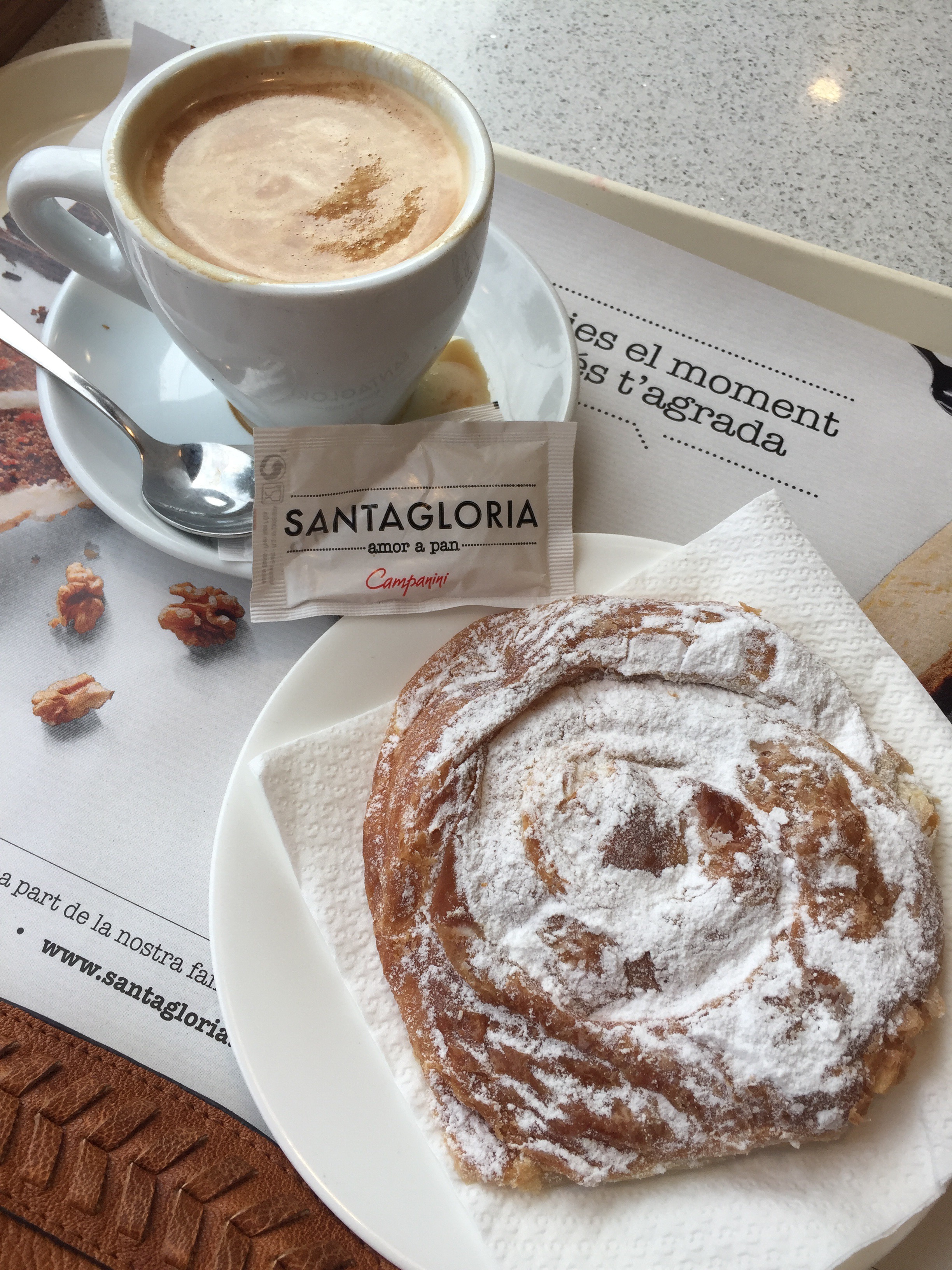 On my last day in Alella, for now, I used a coupon to order a cafe con leche with an empanadilla. I had tried one of these earlier in the week at another Alella bakery but was disappointed by it. However, Santagloria’s empanadilla was so good, I almost ordered another one but resisted for the sake of my waistline. It is basically a flaky, thin pastry topped with powdered sugar. I personally love the dough more than the filling of most turnovers, so this was a dream. But if you prefer the filling to the crust on pastries, I would skip out on this.