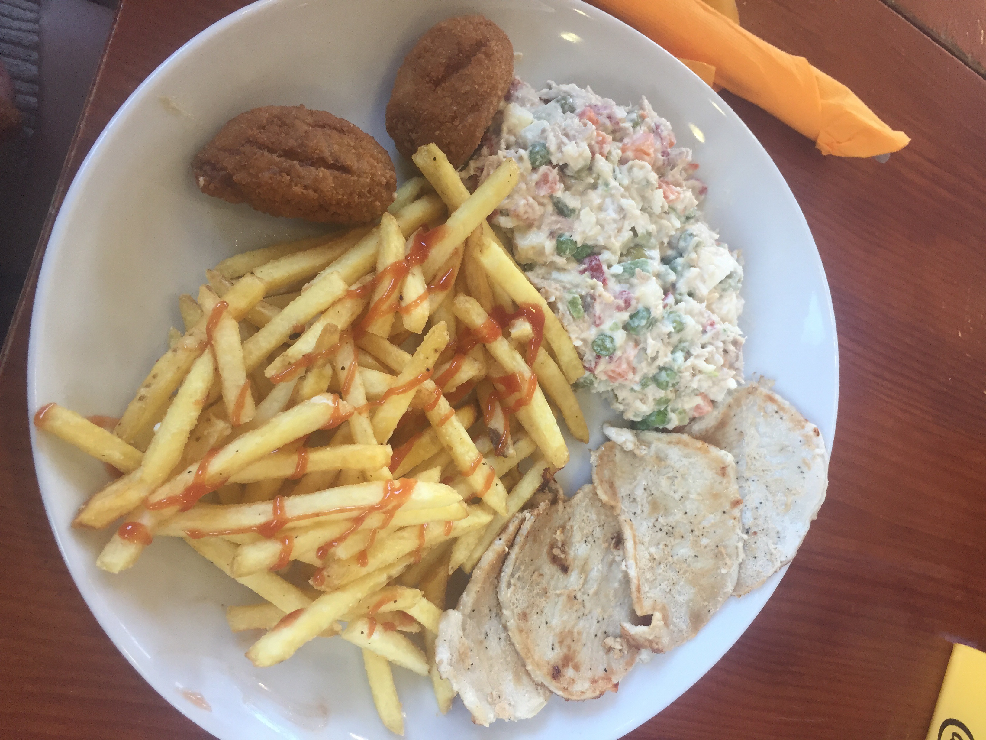 This is one of their combination plates. It was only about 7 euros and comes with pork, Ensaladilla Rusa, french fries, and three chicken croquetas. I was in the process of munching on one as I took this picture. To be honest, I have had dreams with these croquetas since I left Spain. They were so much better than the ones I had in Barcelona which were dry in comparison. These were crispy, flavourful, and just delicious. The pork is seasoned simply which I considered to make a perfect balance with its other tasty co-stars. The Ensaladilla Rusa means Russian salad. It consists of peas, mayonnaise, carrots, potatoes, and tuna. Your meal comes with a basket of sliced french bread, so I suggest topping the bread with the salad. It reminded me of the party appetizers my grandma is known for making in Venezuela. The french fries were crispy as well, nothing too special but still good.