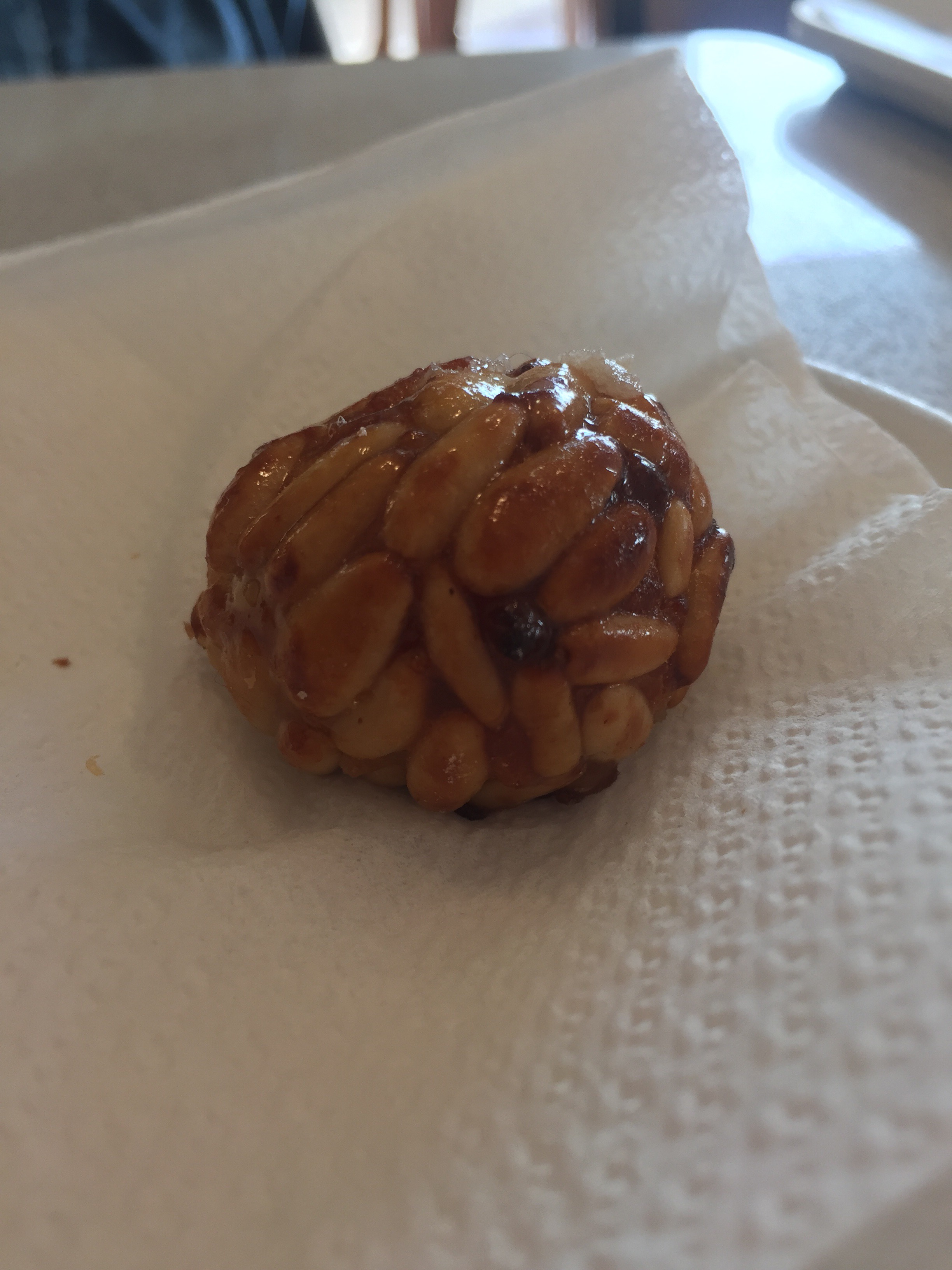 The above is a Panellet, a traditional pastry in Catalonia during the fall season as it is the traditional dessert of All Saints’ Day. They are made of marzipan, a paste made of almonds and sugar , glazed and topped with pine nuts. They are very sweet but the nuts balance it out.