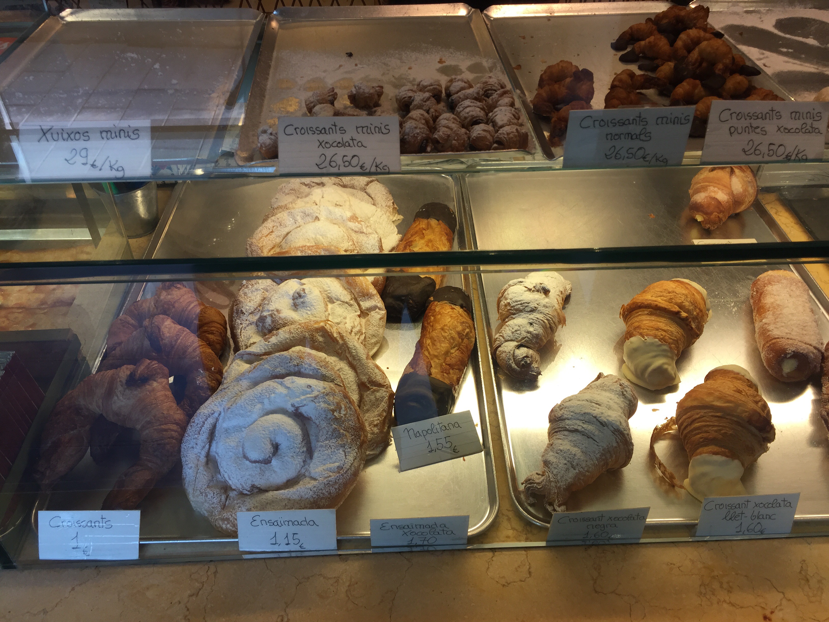 With so many options, I was lost in what I should get, so I asked her for help. She asked if I liked chocolate. I nodded excitedly. She recommended the Napolitana (pictured below). A long flaky pastry with chocolate frosted ends and a nice dollop of chocolate on the inside, it was perfect and only 1.55 euros. La Petita Mallorquina is a can’t miss if only for its family roots.