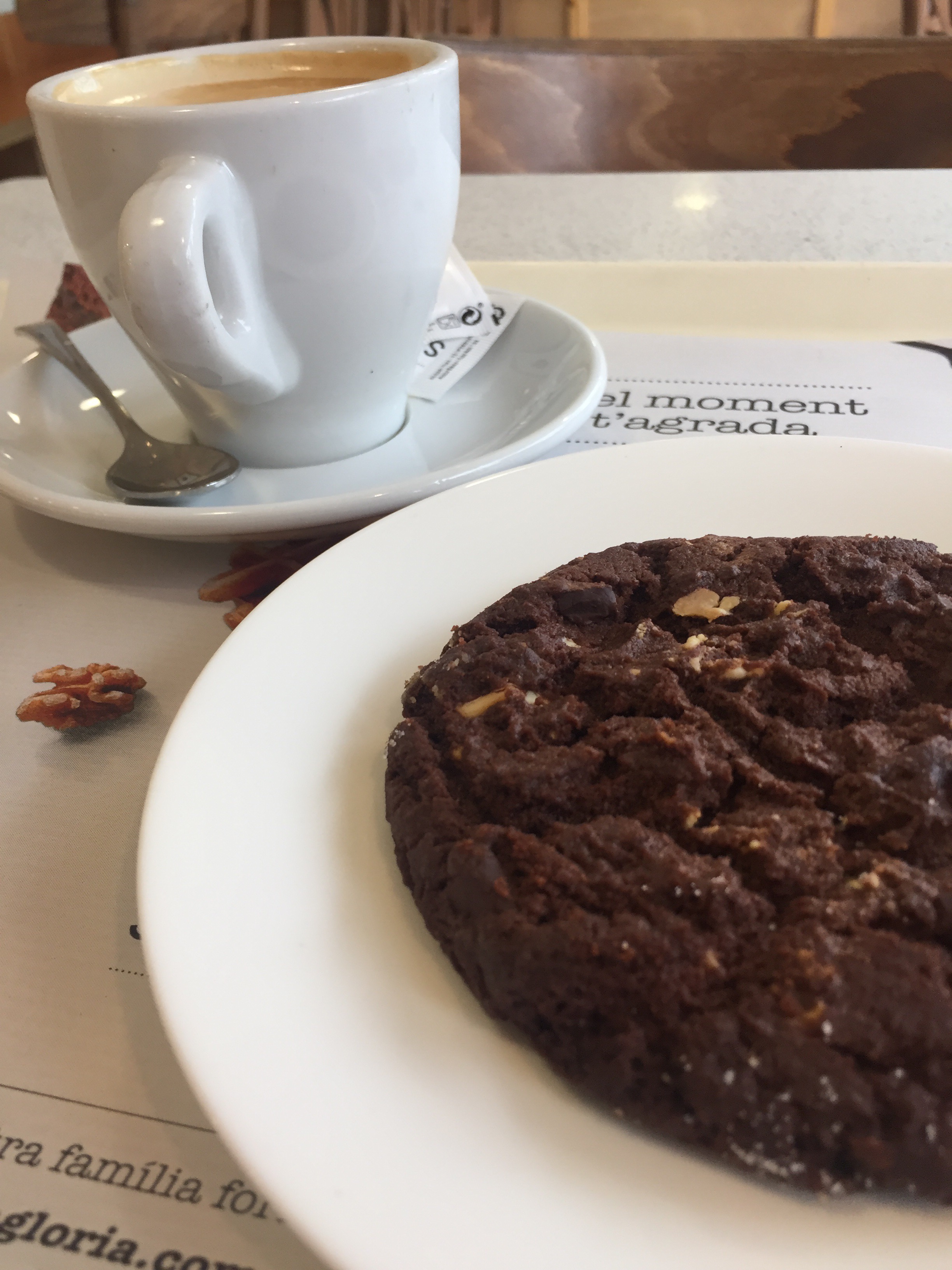 To drink, I always ordered a cafe con leche and added one sugar packet. I’m not a big coffee person, but I was in Spain. These became addicting, as they made me feel warm and cozy. Above is their chocolate croissant, which is flaky, buttery, and has the right amount of sweetness. Try dipping it in your coffee for a grand experience. Below, is their double chocolate cookie. I had this one cloudy afternoon as I took some time to read. It was a great treat for this sweet tooth. It has a nice amount of milk chocolate and white chocolate chips. It’s not super crunchy or super soft. It is strong enough to be dipped in your coffee without crumbling but soft enough that you won’t need your molars to bite into it. The top and bottom pairings were about the same price, less than 3 euros.
