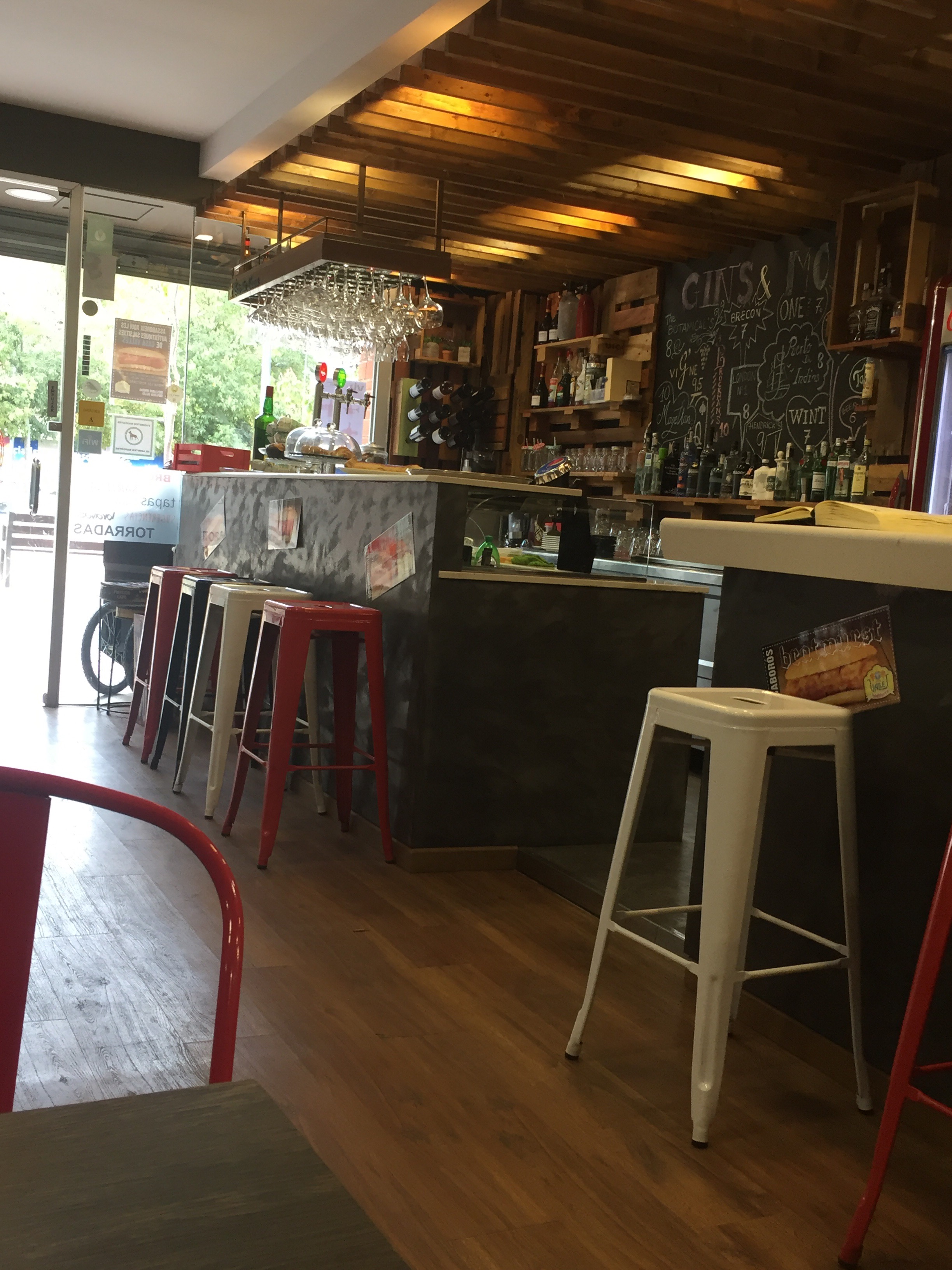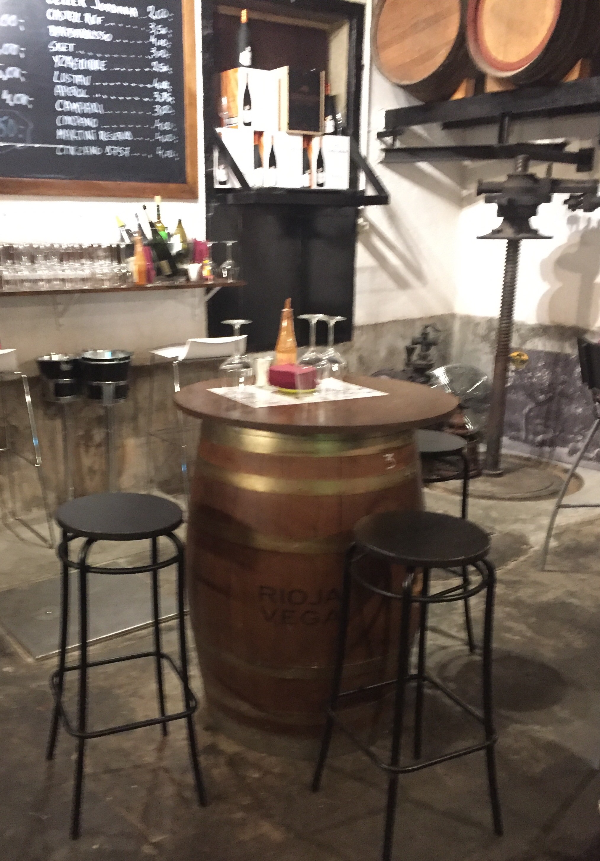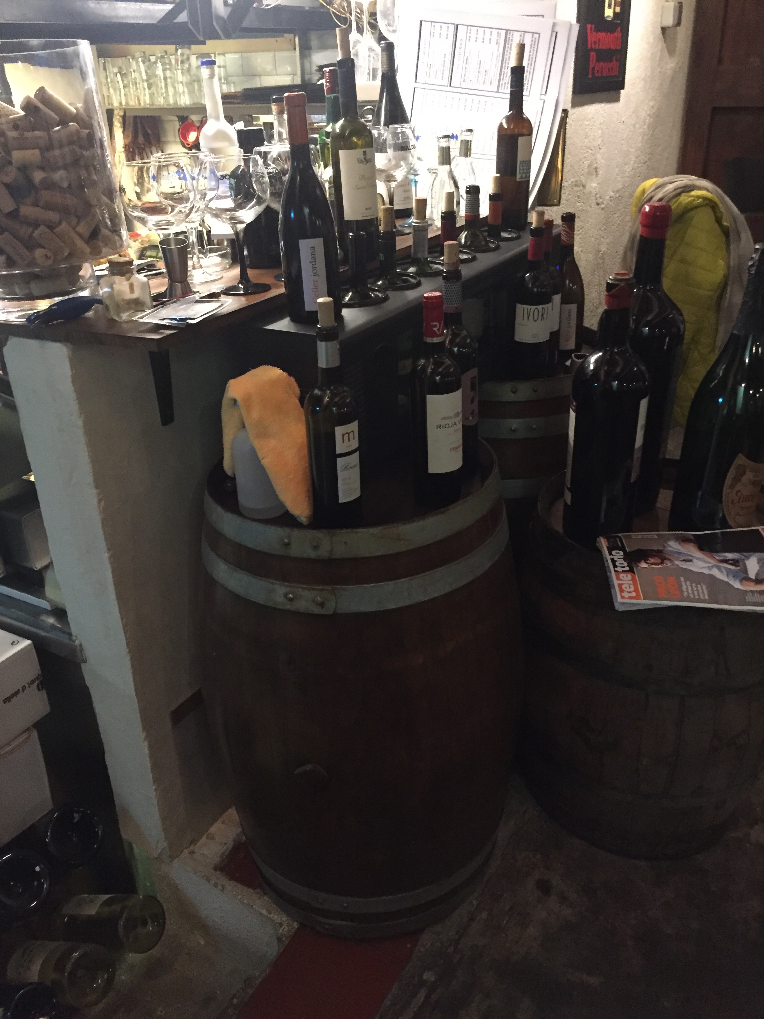Celler Jordana doesn’t look like much on the outside, but the food and the ambience is of the upmost quality. Tables are wine barrels already accompanied by wine glasses. The lighting is dimmed, making it a great place for a date night. There is wine for sale in most areas of the restaurant and a chalkboard with cocktail and wine prices.