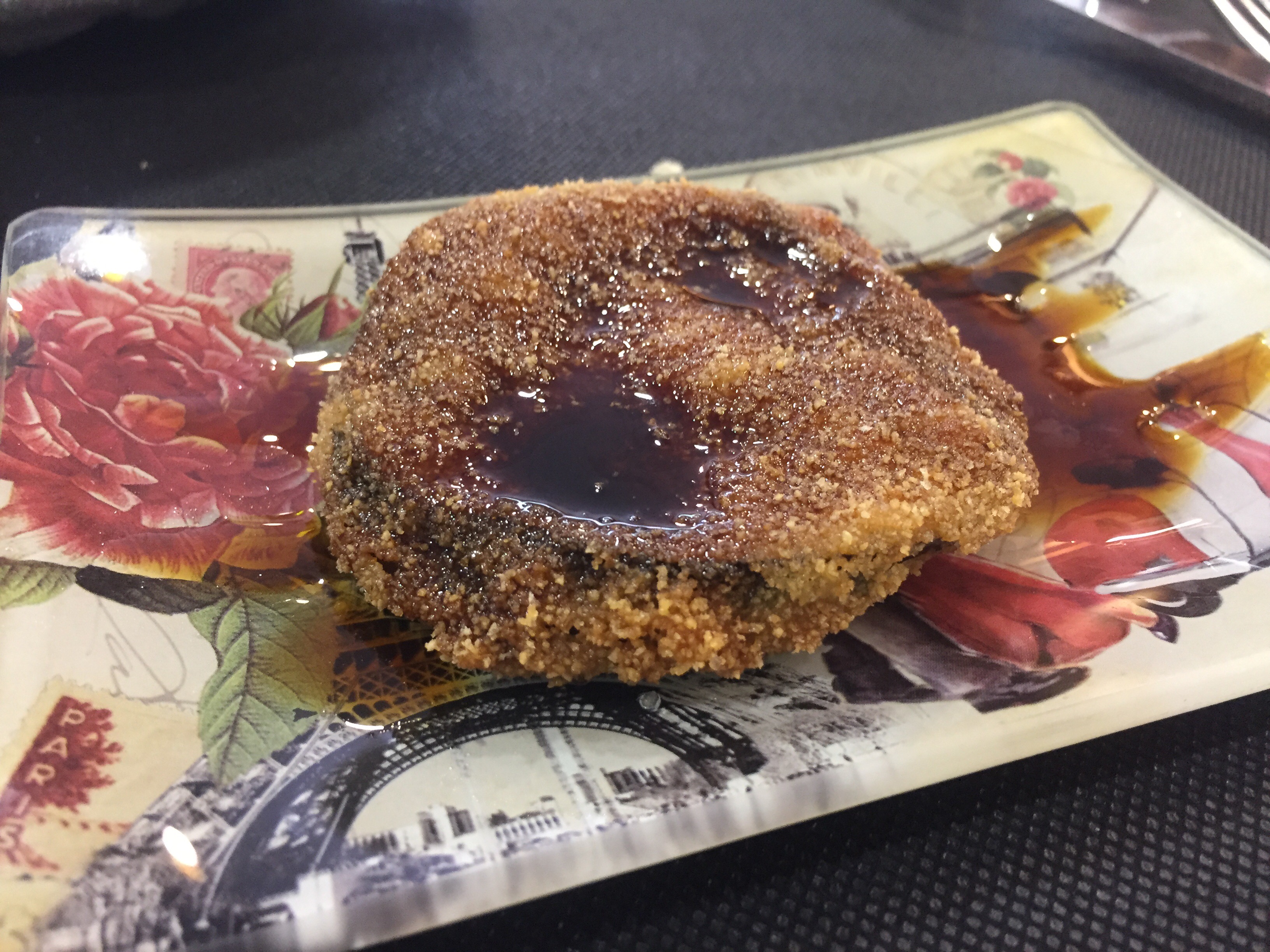 Above is a thinly sliced eggplant, battered and fried with a sweet honey and date based glaze on top. I’m a big fan of combining sweet with salty ingredients, so this was great. The dates kept the sweetness of the honey in check. The eggplant had the right amount of crisp without being too oily.