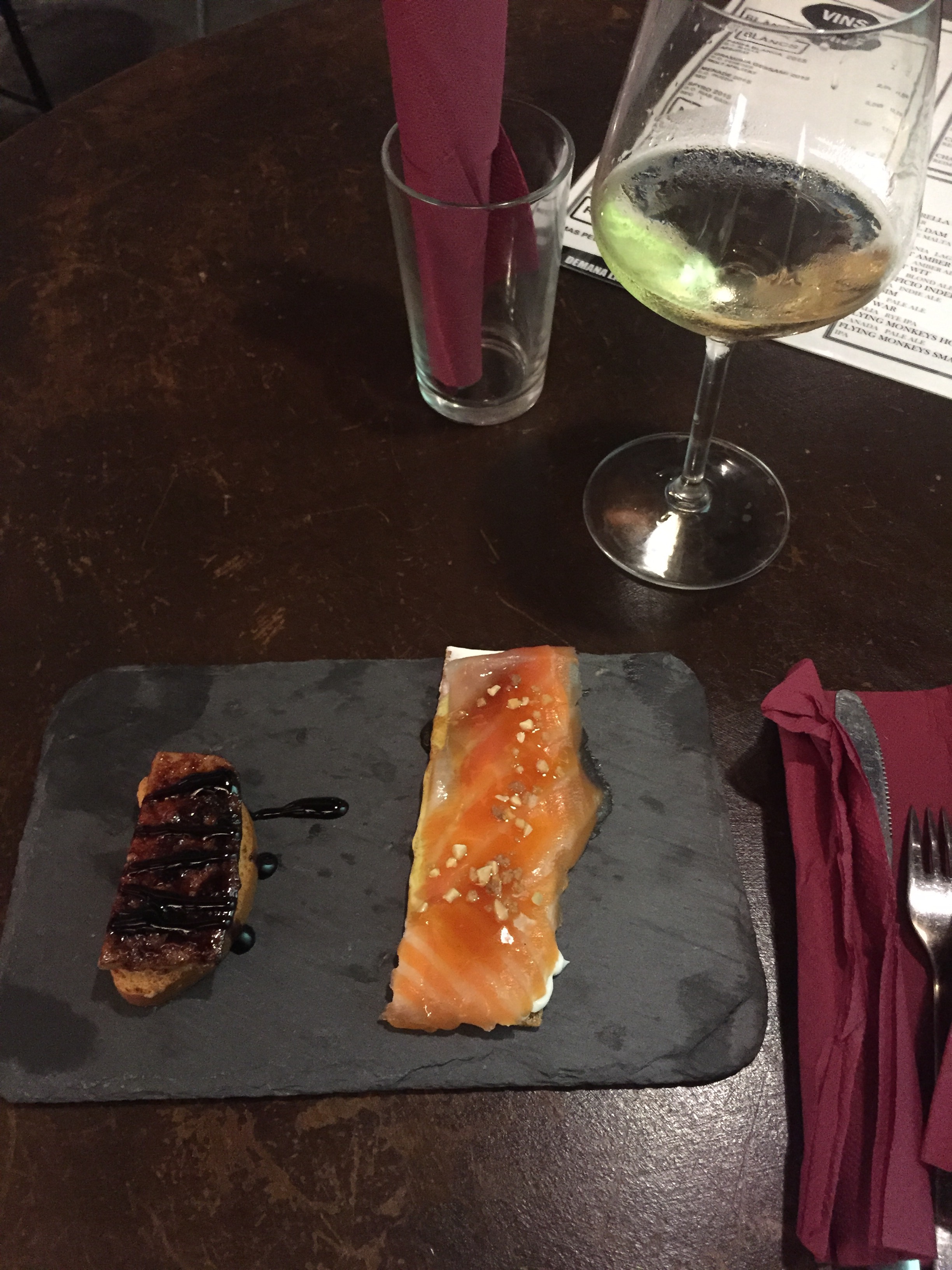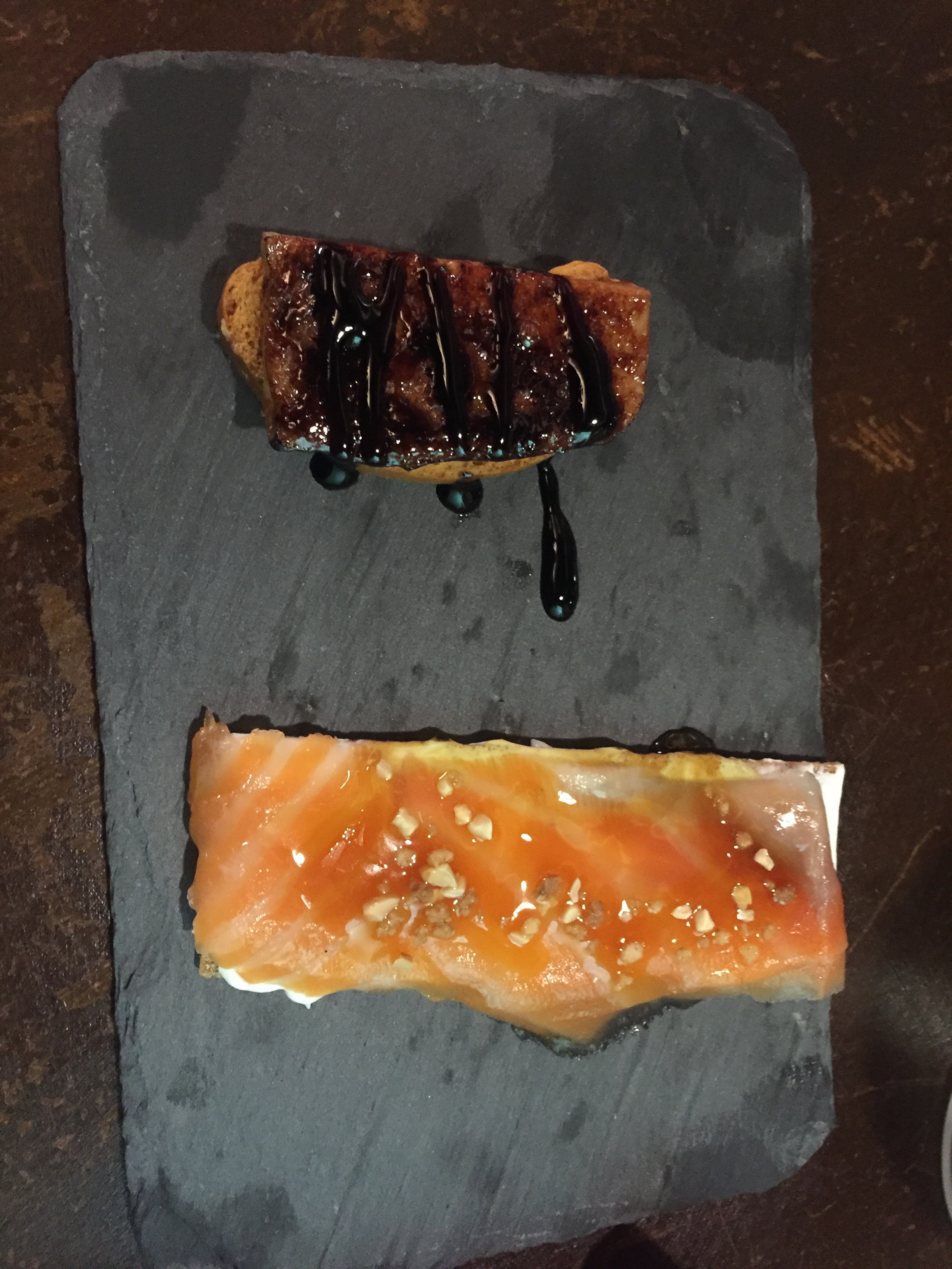 The tapas I ordered made me feel extremely fancy. The first was a toasted slice of french bread, topped with foie gras and a caramelised glaze. This was the second time I had foie gras, not knowing what it was but loving it each time. Well, it is duck liver that has been fattened. Take this as a lesson that you should try things first. The second was raw salmon topped with garlic bits, over a long cracker with a cream cheese spread. It was very fresh and the softness of the salmon made an excellent team with the crunchiness of the cracker.