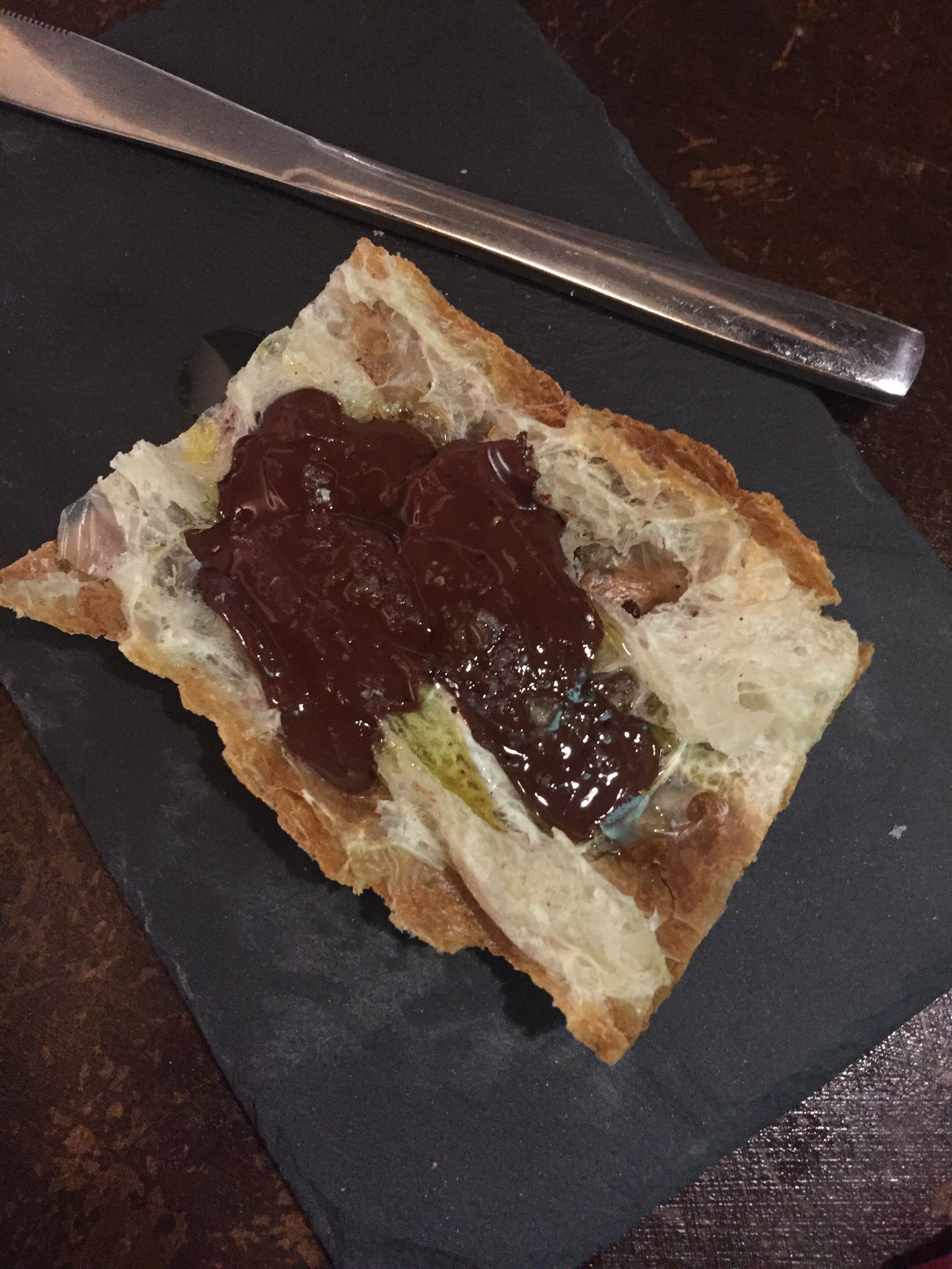 And last but not least, for dessert I had a slice of bread topped with melted chocolate, drizzled with olive oil and sea salt. This might sound strange, but it was a great mix. The salt brought out the sweetness of the chocolate, as did the olive oil. I will definitely try to make this at home.